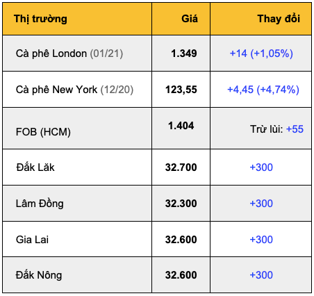 Hôm nay (15/12/2020) giá cà phê tại thị trường Việt Nam và giá cà phê thế giới trên sàn London và New York (ngày 14/12) đều tiếp tục tăng. Giá cà phê Robusta trên sàn London kỳ hạn 01/21 tăng thêm 14 USD/tấn, hay +1,05%, lên mức 1.349 USD/tấn, các kỳ hạn khác cũng tăng 19 - 21 USD/tấn. Giá cà phê arabica trên sàn New York kỳ hạn 12/20 tăng mạnh 4,45 cent/lb, hay +4,74%, lên mức 123,55 cent/lb, các kỳ hạn khác cũng tăng mạnh 4,50 - 4,55 cent/lb. Sáng nay, giá cà phê tại khu vực Tây Nguyên tiếp tục tăng thêm 300 ngàn đồng/tấn, lên mức 32,3 - 32,7 triệu đồng/tấn.