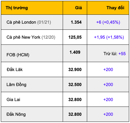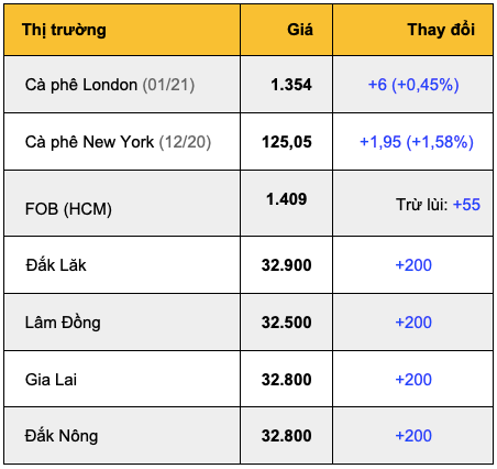 Hôm nay (17/12/2020) giá cà phê tại thị trường Việt Nam và giá cà phê thế giới trên sàn London và New York (ngày 16/12) đều tăng. Giá cà phê Robusta trên sàn London kỳ hạn 01/21 tăng nhẹ 6 USD/tấn, hay +0,45%, lên mức 1.354 USD/tấn, các kỳ hạn khác cũng tăng nhẹ 4 - 6 USD/tấn. Giá cà phê arabica trên sàn New York kỳ hạn 12/20 tăng mạnh 1,95 cent/lb, hay +1,58%, lên mức 125,05 cent/lb, các kỳ hạn khác cũng tăng mạnh 1,95 cent/lb. Sáng nay, giá cà phê tại khu vực Tây Nguyên tăng 200 ngàn đồng/tấn, lên mức 32,5 - 32,9 triệu đồng/tấn.