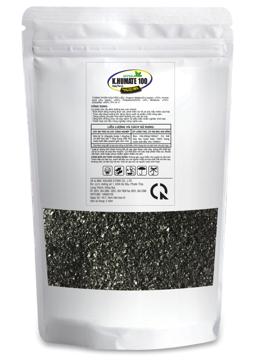 THÀNH PHẦN: Organic Matter(Dry basis): ≥70%; Humic Acid (dry basis): ≥50%; Potassium(K2O): ≥4%; Moisture: ≤15%; Solubility: ≥90%; PH: 8-11