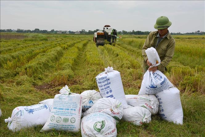 Thu hoạch lúa Mùa tại Nam Định. Ảnh: Công Luật/TTXVN