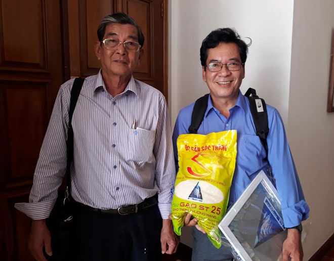 Kỹ sư Hồ Quang Cua (trái) tặng gạo ST25 cho bạn bè sau khi loại gạo này đoạt danh hiệu gạo ngon nhất thế giới 2019. Ảnh: Đình Tuyển