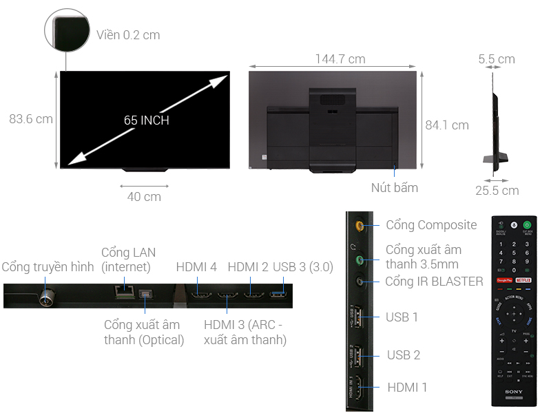 Thông số kỹ thuật chi tiết Android Tivi OLED Sony 4K 65 inch KD-65A8F