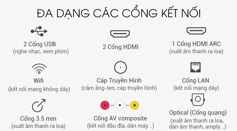 Smart tivi được trang bị các cổng kết nối thông dụng: HDMI, USB, Optical... giúp bạn kết nối tivi với nhiều các thiết bị ngoài như đầu đĩa, dàn âm thanh, laptop... để xem phim, nghe nhạc,...