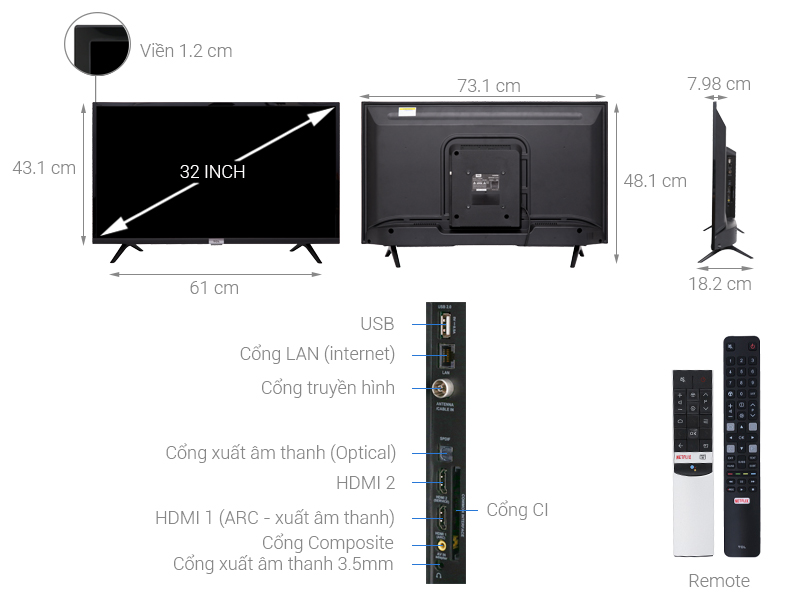 | Kích thước không chân/treo tường | Ngang 73.1 cm - Cao 43.1 cm - Dày 7.98 cm |