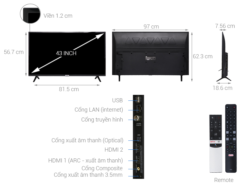 | Kích thước không chân/treo tường | Ngang 97 cm - Cao 56.7 cm - Dày 7.56 cm |