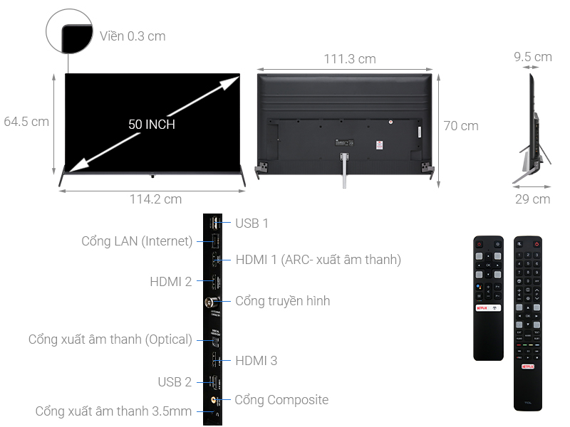 Kích thước tivi TCL 50 inch thích hợp bố trí vào nhiều không gian nội thất khác nhau như phòng họp, phòng khách lớn,...