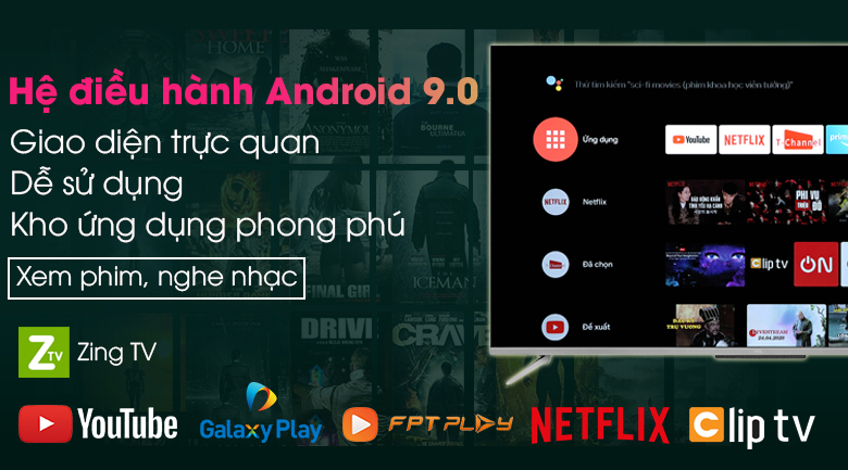 Giao diện trực quan, dễ dùng, thư viện ứng dụng phong phú, có sẵn các ứng dụng gồm YouTube, Netflix, Zing TV, FPT Play, Clip TV. Ngoài ra, bạn còn có thể cài thêm các ứng dụng khác như Galaxy Play, VTVCab ON,..