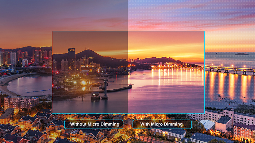Công nghệ Micro Dimming sẽ phân tích từng nội dung video ở hàng trăm khu vực riêng biệt mà ở nơi đó mà ở nơi đó sẽ điều chỉnh độ sáng và độ tối riêng biệt. Bạn sẽ phải ngạc nhiên với khung cảnh có độ tương phản chuẩn nhất và chất lượng hình ảnh sống động.
