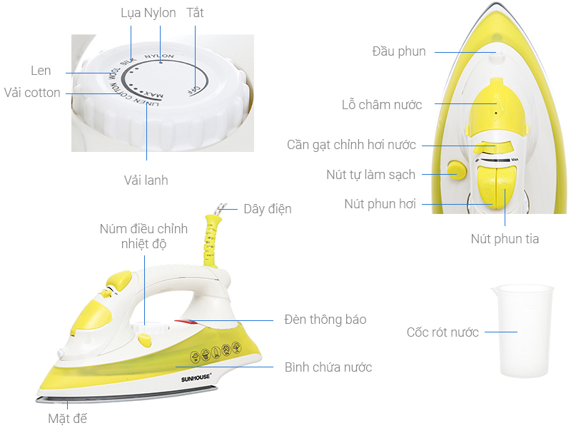 Với gam màu vàng rực rỡ, cho bàn ủi Sunhouse tỏa sáng, nổi bật ở mọi địa điểm sắp đặt, thiết kế gọn đẹp, tiện dụng, công suất 1800 W, ủi quần áo mau thẳng
