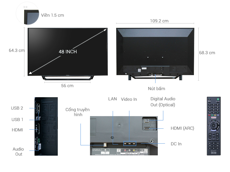 | Kích thước không chân/treo tường | Ngang 109.2 cm - Cao 64.3 cm - Dày 6.6 cm |