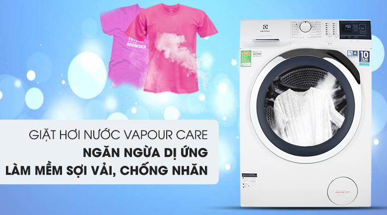 Công nghệ Vapour Care sẽ kết thúc mỗi chu trình giặt bằng một lượng hơi nước nóng giúp loại bỏ tới 99.9% chất gây dị ứng và vi khuẩn và giúp làm mềm sợi vải, chống nhăn hiệu quả, bạn sẽ không cần phải tốn thời gian là ủi sau mỗi lần giặt nữa.
