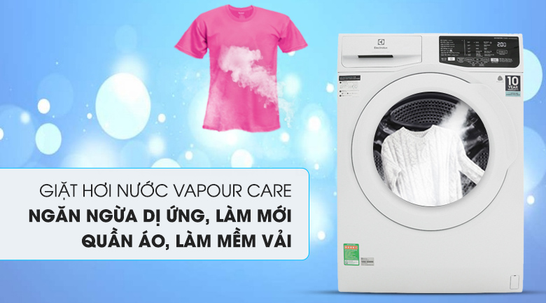 Với gia đình có trẻ nhỏ hoặc người thân có làn da dễ bị dị ứng thì công nghệ giặt hơi nước Vapour Care của máy giặt Electrolux chính là một vị cứu tinh sáng giá. Nhờ Vapour Care, quần áo sẽ được giặt bằng hơi nước ở nhiệt độ cao, góp phần đẩy lùi vi khuẩn và tác nhân gây dị ứng có trên quần áo.