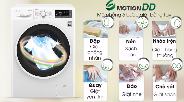 Mô phỏng theo hoạt động giặt tay của con người, công nghệ giặt 6 chuyển động trên chiếc máy giặt LG này không chỉ nâng cao hiệu quả giặt sạch mà nó còn chăm sóc êm dịu cho quần áo trong quá trình giặt, ngăn chặn tình trạng sờn, rách hay tưa chỉ, góp phần bảo vệ quần áo được bền đẹp như mới với thời gian.