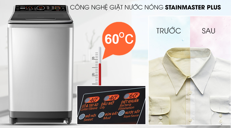 Ngay cả khi quần áo bị bùn đất, dầu mỡ hay các vết bẩn cứng đầu bám vào, máy giặt với trang bị công nghệ giặt nước nóng StainMaster+ sẽ sử dụng nước nóng ở nhiệt độ cao (40 - 60 độ C) để giặt sạch hoàn toàn, trả lại vẻ sạch đẹp ban đầu cho những chiếc quần áo của bạn.