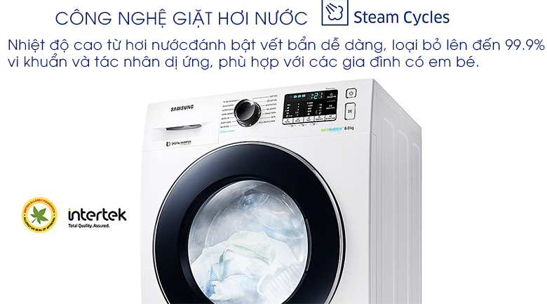 Công nghệ giặt hơi nước với cơ chế hoạt động nước sẽ được đun nóng thành hơi và phun liên tục vào quần áo kết hợp với chuyển động quay của máy giặt. Nhiệt độ cao từ hơi nước sẽ giúp loại bỏ các vi khuẩn cũng như các tác nhân gây dị ứng và dễ dàng đánh bật các vết bẩn trên quần áo, chăn màn,…
