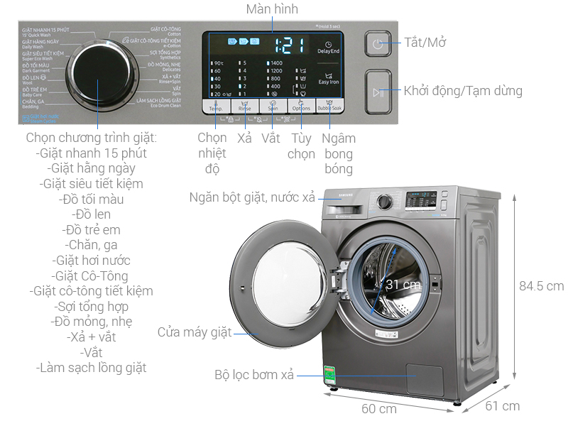 Máy giặt Inverter được thiết kế với 14 chương trình giặt khác nhau, đáp ứng tối ưu nhu cầu giặt giũ thông dụng cho người dùng. Bạn sẽ dễ dàng lựa chọn chế độ giặt phù hợp để giặt hiệu quả. Đặc biệt với chế độ giặt khoảng 2kg quần áo mỏng nhẹ, ít bẩn chỉ trong 15 phút thì giờ đây thời gian mỗi khi giặt giũ sẽ không là điều bận tâm của người tiêu dùng nữa.