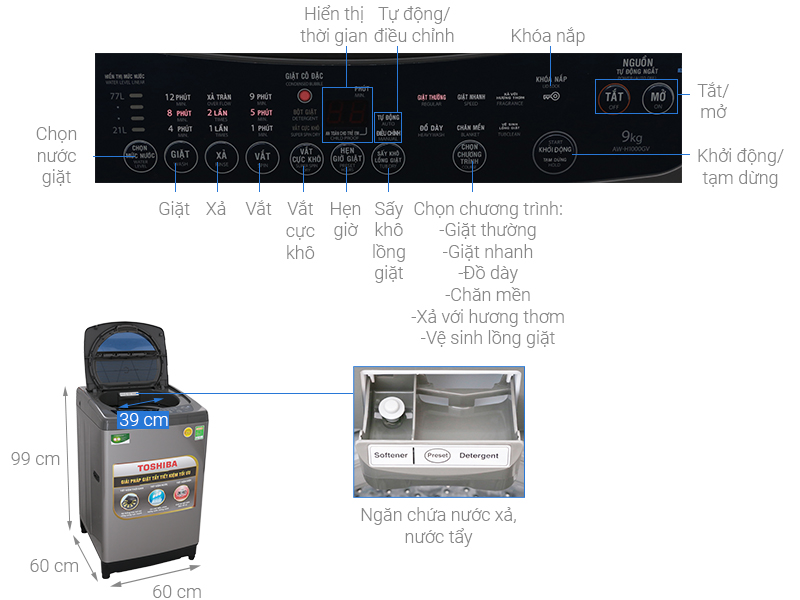 Thiết kế cửa trên, lồng đứng với khối lượng giặt 9kg máy sẽ giải quyết được nhu cầu giặt giũ của các gia đình có trên 6 thành viên.