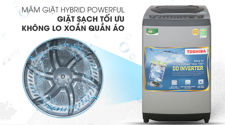 Thiết kế cánh quạt không đối xứng đặc biệt của mâm giặt Hybrid Powerful trên máy giặt Toshiba AW-DJ1000CV SK sẽ làm cho đồ giặt được nhào trộn mạnh mẽ, mang lại hiệu quả giặt sạch tối ưu mà không lo quần áo bị xoắn rối nhiều sau mỗi mẻ giặt.