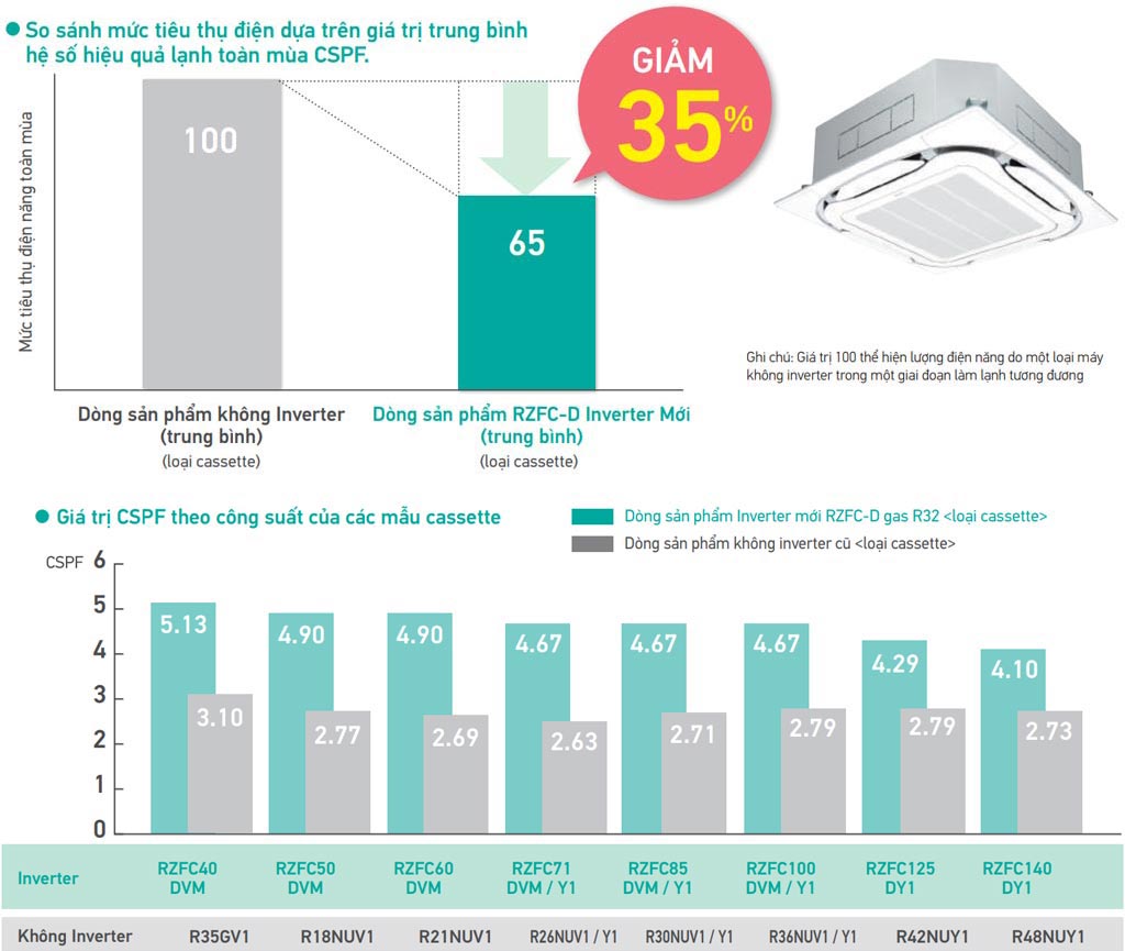 So với các dòng sản phẩm không inverter trước đây, dòng sẵn phẩm mới RZF-C tiêu thụ năng lượng ít hơn khoảng 80%, làm lạnh nhanh và hiệu quả với ít điện năng hơn.