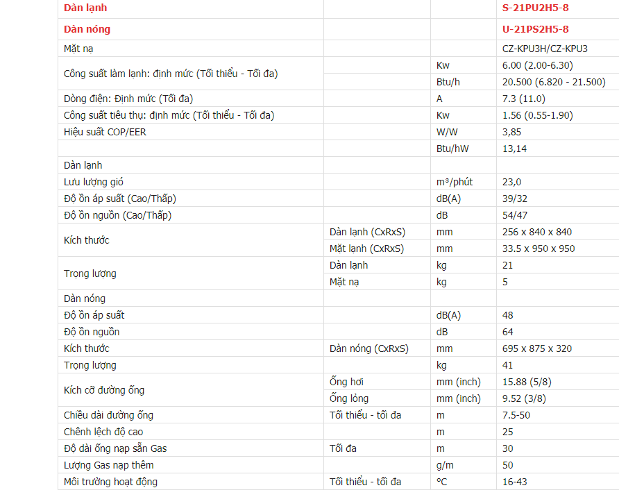 Thông số kĩ thuật máy lạnh âm trần Panasonic S-21PU2H5-8/U-21PS2H5-8