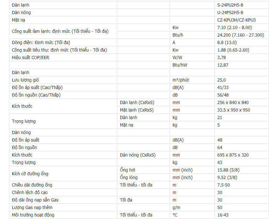 Thông số kĩ thuật máy lạnh âm trần Panasonic S-24PU2H5-8/U-24PS2H5-8