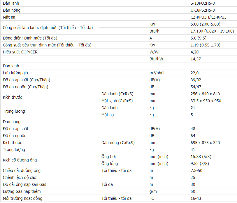 Thông số kĩ thuật máy lạnh âm trần Panasonic S-18PU2H5-8/U-18PS2H5-8 Inverter