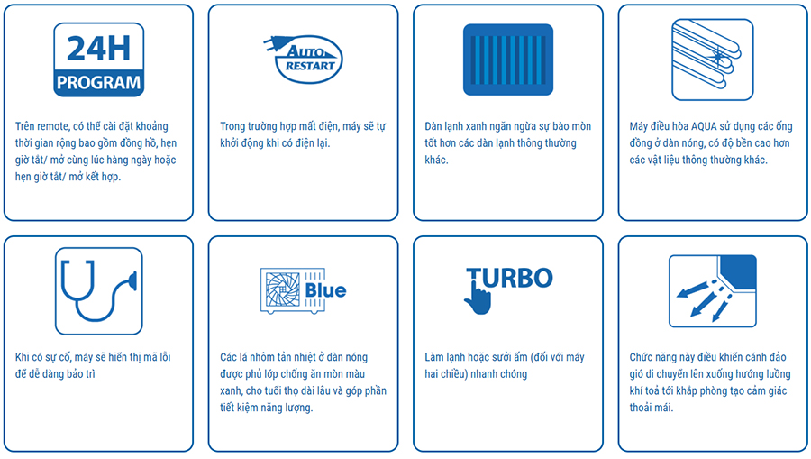 Ngoài ra, máy lạnh Inverter Aqua còn trang bị tính năng tự động làm sạch, giúp diệt khuẩn, khử mùi hiệu quả. Bên cạnh đó, máy lạnh Aqua thế hệ mới còn mang đến nhiều tính năng gần gũi khác như trang bị bộ vi xử lý điều chỉnh tốc độ quạt, chức năng chẩn đoán lỗi, tích hợp đèn LED hiển thị và hiện đại hơn là trong trường hợp mất điện, máy sẽ tự khởi động khi có điện lại.