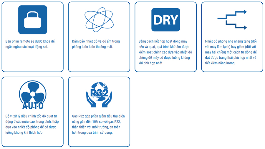 | Tiện ích | Chế độ nghỉ ngơi nhân bản, Chế độ vận hành quạt tự động, Chế độ điều khiển luồng khí quét tự động, Chế độ cài đặt hẹn giờ mở/tắt trong vòng 24 giờ, Chế độ hút ẩm, Dàn nóng xanh và dàn lạnh xanh chống ăn mòn “Blue Fin”, Đèn LED hiển thị |