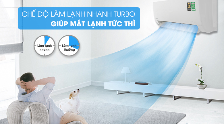 Chiếc máy lạnh này sẽ làm lạnh nhanh chóng, bạn chỉ cần kích hoạt chế độ làm lạnh nhanh Turbo trên remote, máy lạnh sẽ hoạt động tạo ra một lưu lượng gió lớn hơn để có thể đạt được nhiệt độ lạnh nhanh hơn trong vòng 3 phút, lập tức sẽ đánh tan không khí nóng bức căn phòng của bạn.
