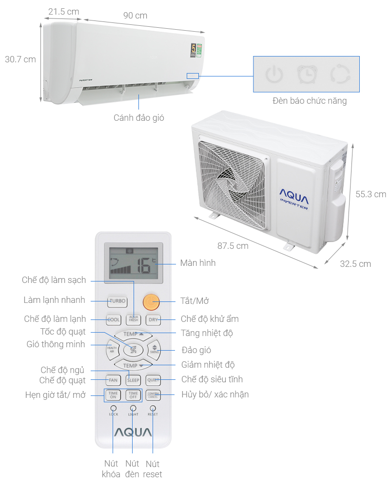 Thông tin cục nóng: Dài 87.5 cm - Cao 55.3 cm - Dày 32.5 cm - Nặng 33.3 kg