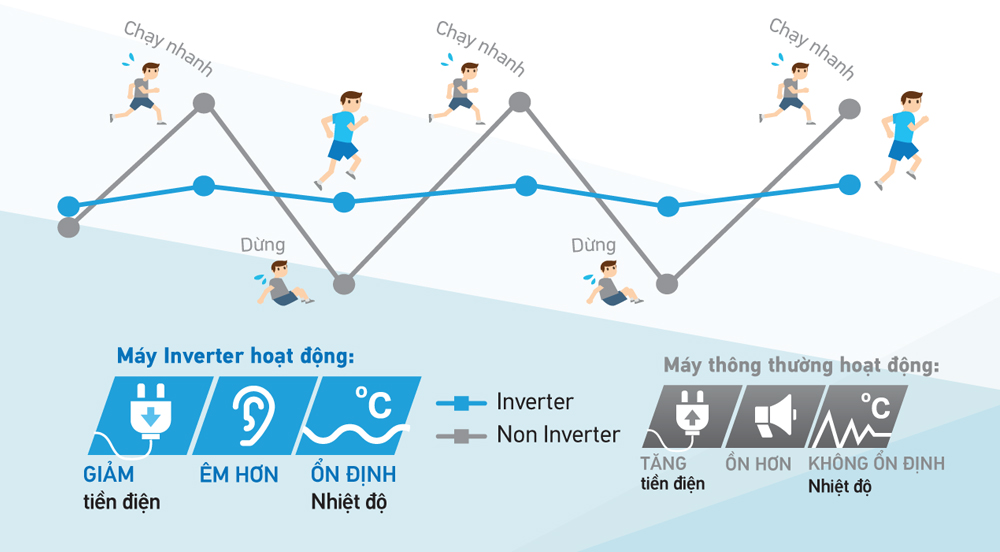 Công nghệ tiết kiệm điện năng do loại bỏ được quá trình hoạt động lãng phí của máy điều hòa không khí bằng cách điều khiển hiệu quả tốc độ động cơ máy nén