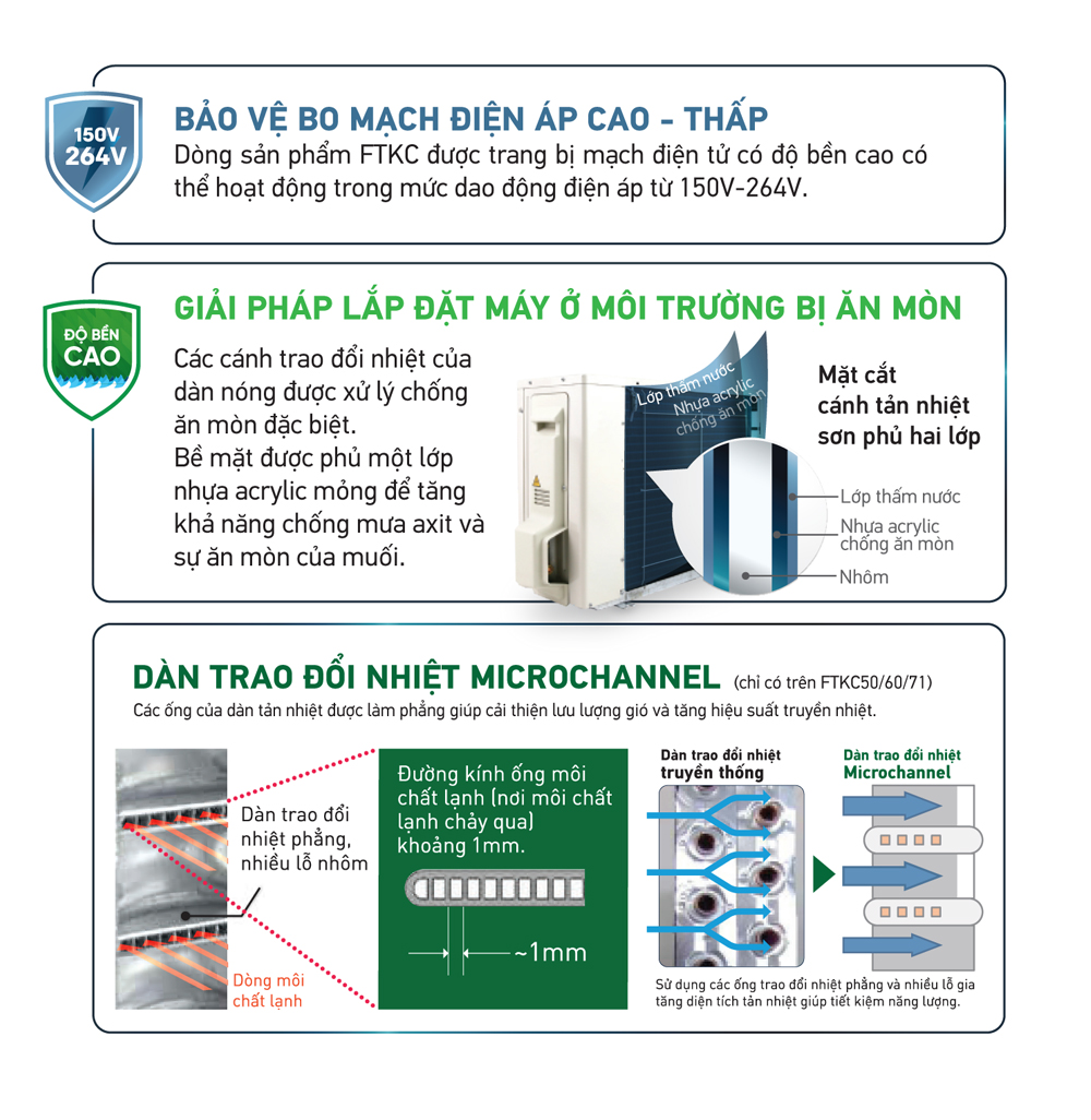 Bề mặt được phủ một lớp nhựa acrylic mỏng để tăng khả năng chống mưa axit và sự ăn mòn của muối. Dòng sản phẩm FTKC được trang bị mạch điện tử có độ bền cao có thể hoạt động trong mức dao động điện áp từ 150V-264V.