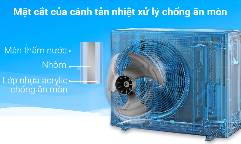 Lớp nhựa Acrylic phủ trên bề mặt cánh tản nhiệt có tác dụng chống lại khả năng ăn mòn do mưa axit và hơi muối. Ngoài ra, lớp màng bên trong có khả năng thấm nước cũng hạn chế rỉ sét khi dàn nóng phải để ngoài trời thường xuyên.