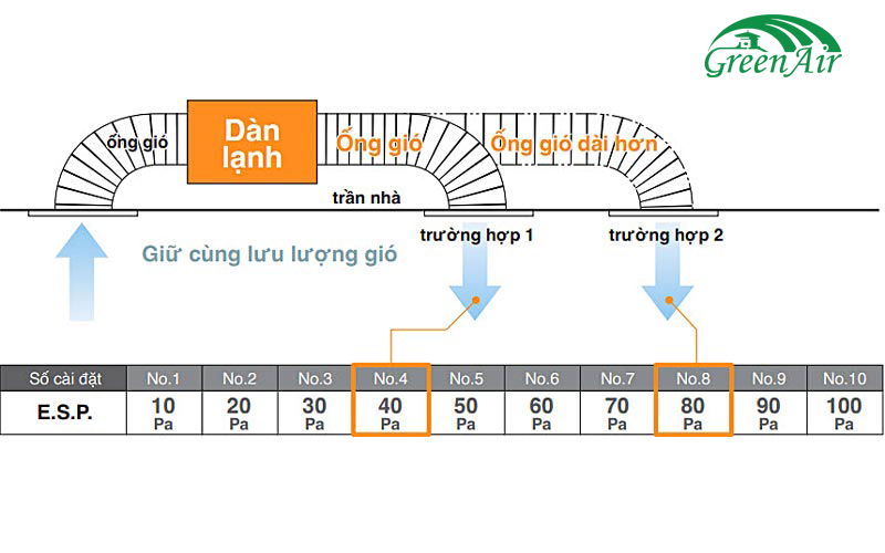 Người dùng có thể cài đặt áp suất tĩnh ngoài (E.S.P) bằng cách điều chỉnh nút E.S.P trên bộ điều khiển dây.