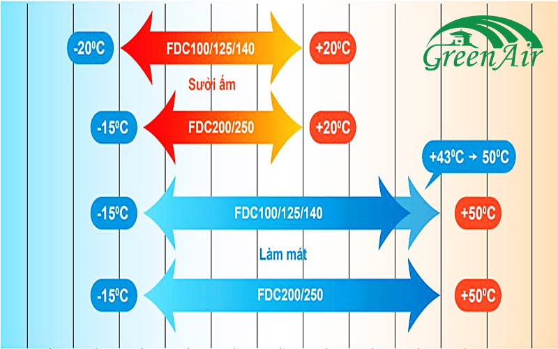 Điều này cho phép thiết bị hoạt động trong điều kiện nhiệt độ ngoài trời xuống thấp đến -15oC/-20oC khi hoạt động chế độ sưởi và -15oC khi hoạt động chế độ làm lạnh.