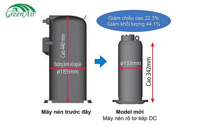 Sử dụng máy nén rô tơ kép DC cho khả năng vận hành tốc độ cao tối đa lên đến 120 vòng/giây để đảm bảo công suất theo yêu cầu.