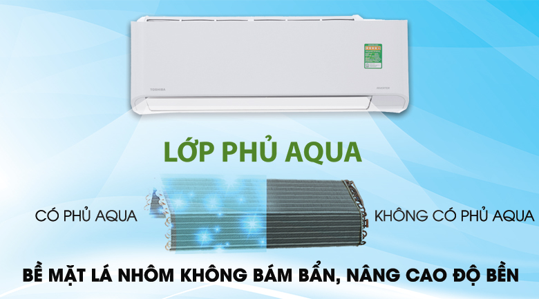 Được ứng dụng trên cả dàn nóng lẫn dàn lạnh của máy lạnh Toshiba RAS-H13PKCVG-V. Ở dàn lạnh được trang bị lớp phủ đặc biệt có tên gọi là Aqua. Lớp phủ này sẽ ngăn ngừa bụi bẩn, vi khuẩn, nấm mốc bám vào lá nhôm trong suốt quá trình hoạt động, tiết kiệm điện năng tối ưu, giảm chi phí bảo trì cũng như giúp máy hoạt động trong luồng không khí trong lành hơn.