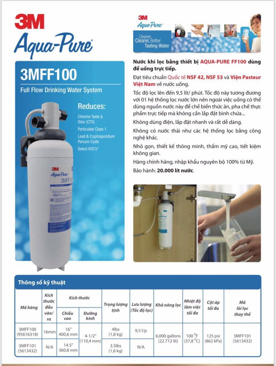 * Nước khi lọc bằng thiết bị AQUA-PURE FF100 dùng để UỐNG TRỰC TIẾP. Lọc sạch 99% vi khuẩn (kích thước vi khuẩn nhỏ 0.2 Micron)