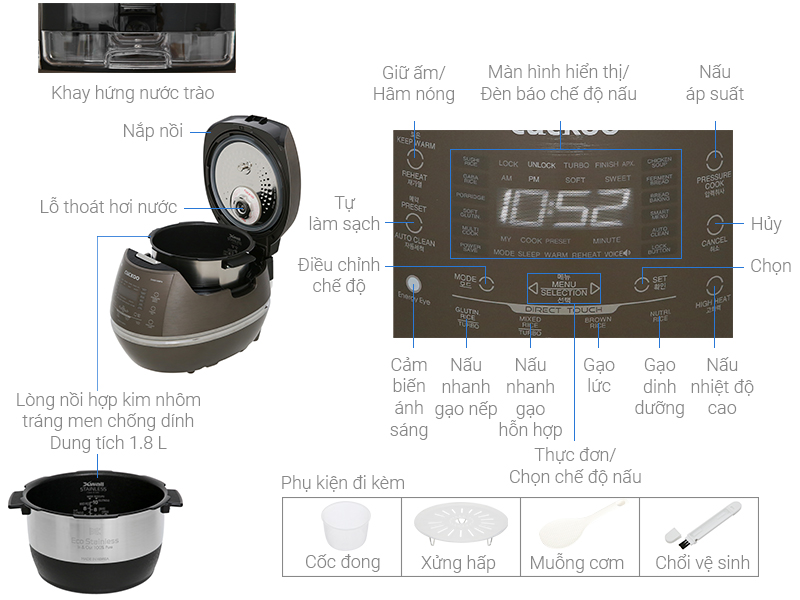 Ngoài ra, nồi còn cài đặt chế độ hẹn giờ nấu, chế độ điều khiển bằng giọng nói, cảm biến ánh sáng, khóa bảng khiển, chế độ tự làm sạch cho bạn sử dụng nồi thuận tiện, tiết kiệm thời gian nấu ăn, vệ sinh, dùng nồi an toàn, bền lâu hơn.