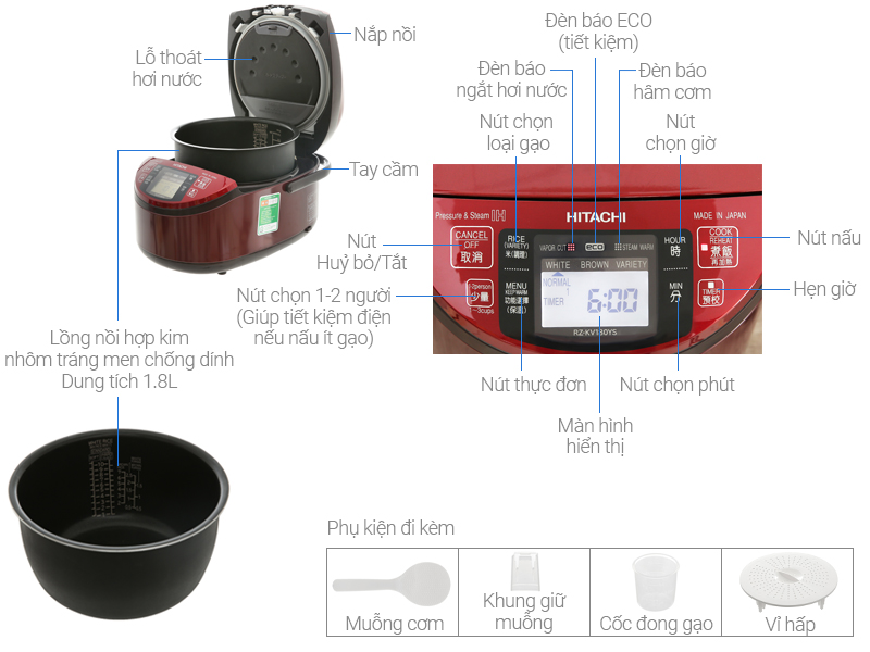 Nồi cơm điện cao tần Hitachi 1.8 lít RZ-KV180YS sản phẩm chất lượng cao thương hiệu uy tín, gia dụng cao cấp gia tăng chất lượng bữa ăn gia đình.
