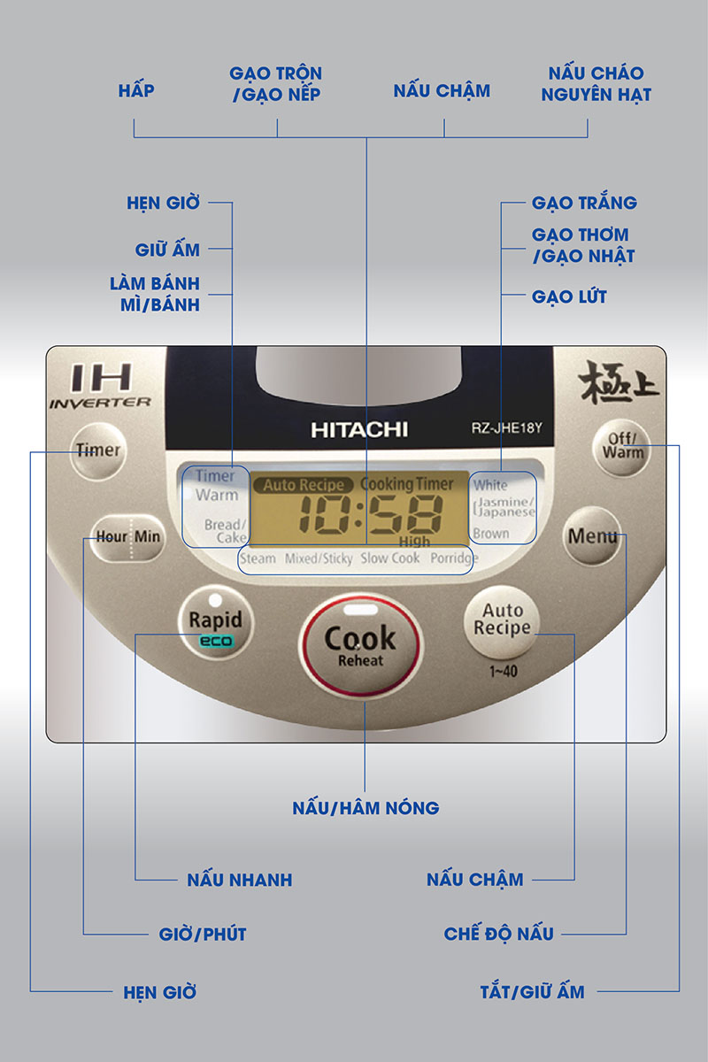 Nồi cơm điện cao tần Hitachi RZ-JHE18Y giúp bà nội trợ chế biến nhiều món ngon với các chế độ nấu được cài đặt sẵn là nấu cơm, cơm trộn, làm bánh, bánh mì, nấu cháo, hấp, nấu chậm, gạo Nhật Bản, gạo thơm, gạo lứt, gạo nếp (xôi), nấu nhanh.