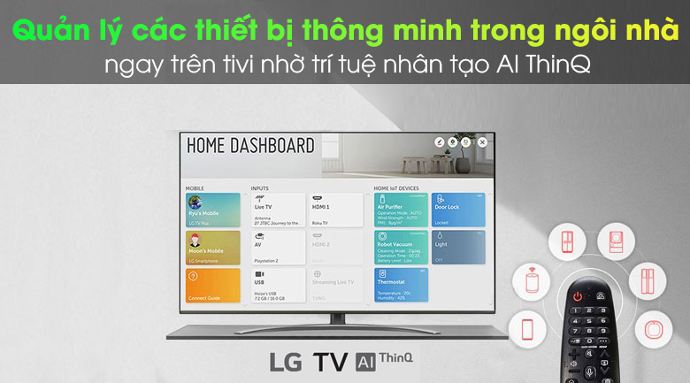 Ngoài ra, với AI ThinQ thấu hiểu thói quen người dùng, nhận diện qua giọng nói của bạn, sẽ ghi nhớ và hiển thị trên màn hình các chương trình bạn thường xem để đưa ra các đề xuất phù hợp với sở thích, chẳng hạn như phim, chương trình biểu diễn hoặc âm nhạc…. Bên cạnh đó nó còn giúp bạn điều khiển dễ dàng nhiều thiết bị thông minh khác ngay trên màn hình Smart tivi này.