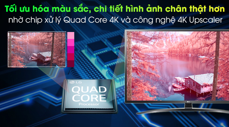 Tivi LG 4K được trang bị bộ vi xử lí 4 nhân(Quad Core 4K) có khả năng loại chính xác nhiễu, tạo ra màu sắc và độ tương phản sinh động hơn, đồng thời với công nghệ 4K Upscaler những hình ảnh có độ phân giải thấp sẽ được nâng cấp lên chuẩn chất lượng gần 4K, gia tăng trải nghiệm của người dùng.