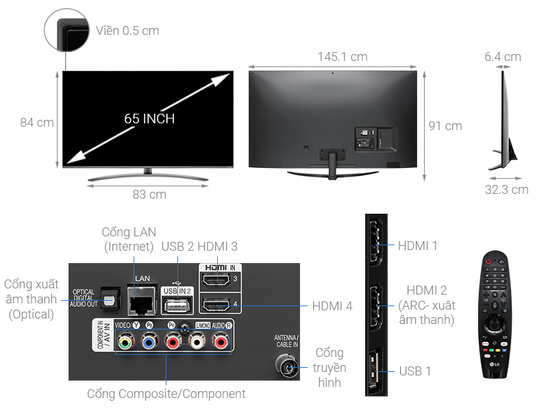 | Kích thước không chân/treo tường | 1451 x 840 x 64 mm |