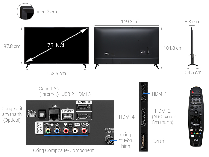 | Kích thước không chân/treo tường | 1693 x 978 x 88.8 mm |
