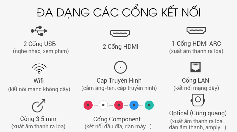 Tivi hỗ trợ bạn dùng được chuột, bàn phím và nhiều cổng kết nối thông dụng: HDMI, USB, Optical... để kết nối tivi với nhiều thiết bị ngoài như đầu đĩa, dàn âm thanh, laptop...