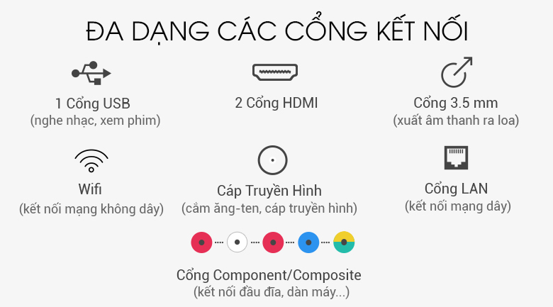 Cổng kết nối bao gồm: HDMI, LAN, WIFI, USB... giúp chiếc smart tivi Samsung này kết nối cùng lúc với nhiều thiết bị bên ngoài như loa, máy tính, bàn phím, wifi, USB... mà tất cả các thiết bị ấy hoạt động mượt mà, không bị gián đoạn.
