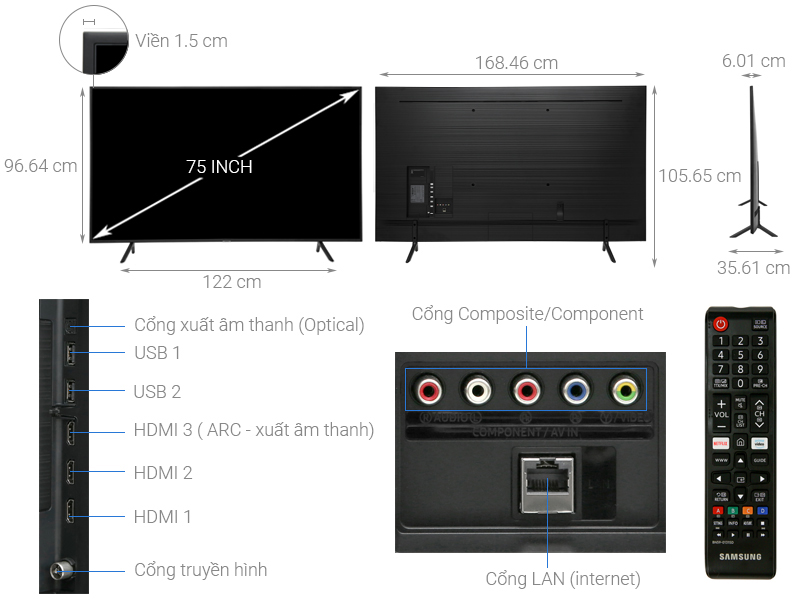 Màn hình tivi Samsung 75 inch thích hợp sử dụng trong các không gian có diện tích lớn như phòng khách, văn phòng, nhà hàng