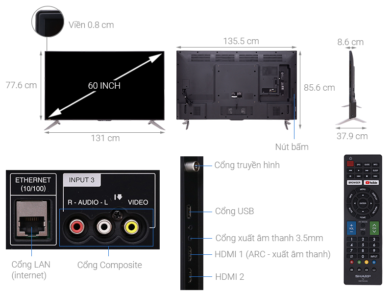 Thông số kỹ thuật chi tiết Smart Tivi Sharp 4K 60 inch LC-60UA6500X