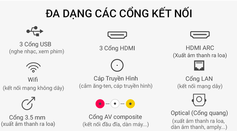 - Cổng xuất âm thanh:Jack loa 3.5 mm, Cổng Optical (Digital Audio Out), HDMI ARC